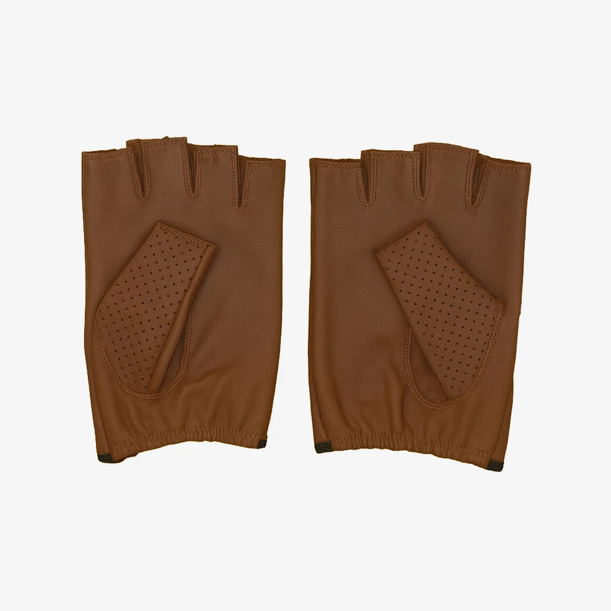 Carlo Sacchi half-finger sport gloves in supple cowhide — perforation for ventilation, athletic grip and durable flexibility. Ideal for driving, cycling, fitness and urban lifestyle. Luxury sport-performance in cognac.