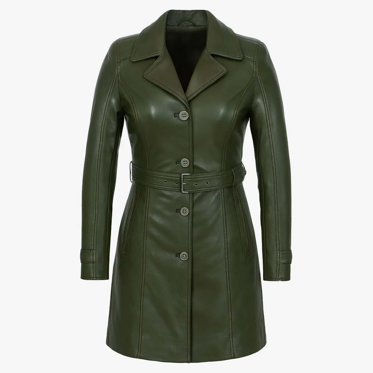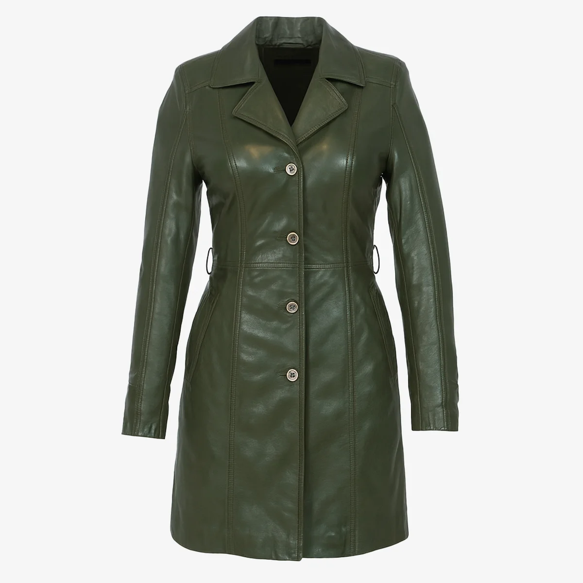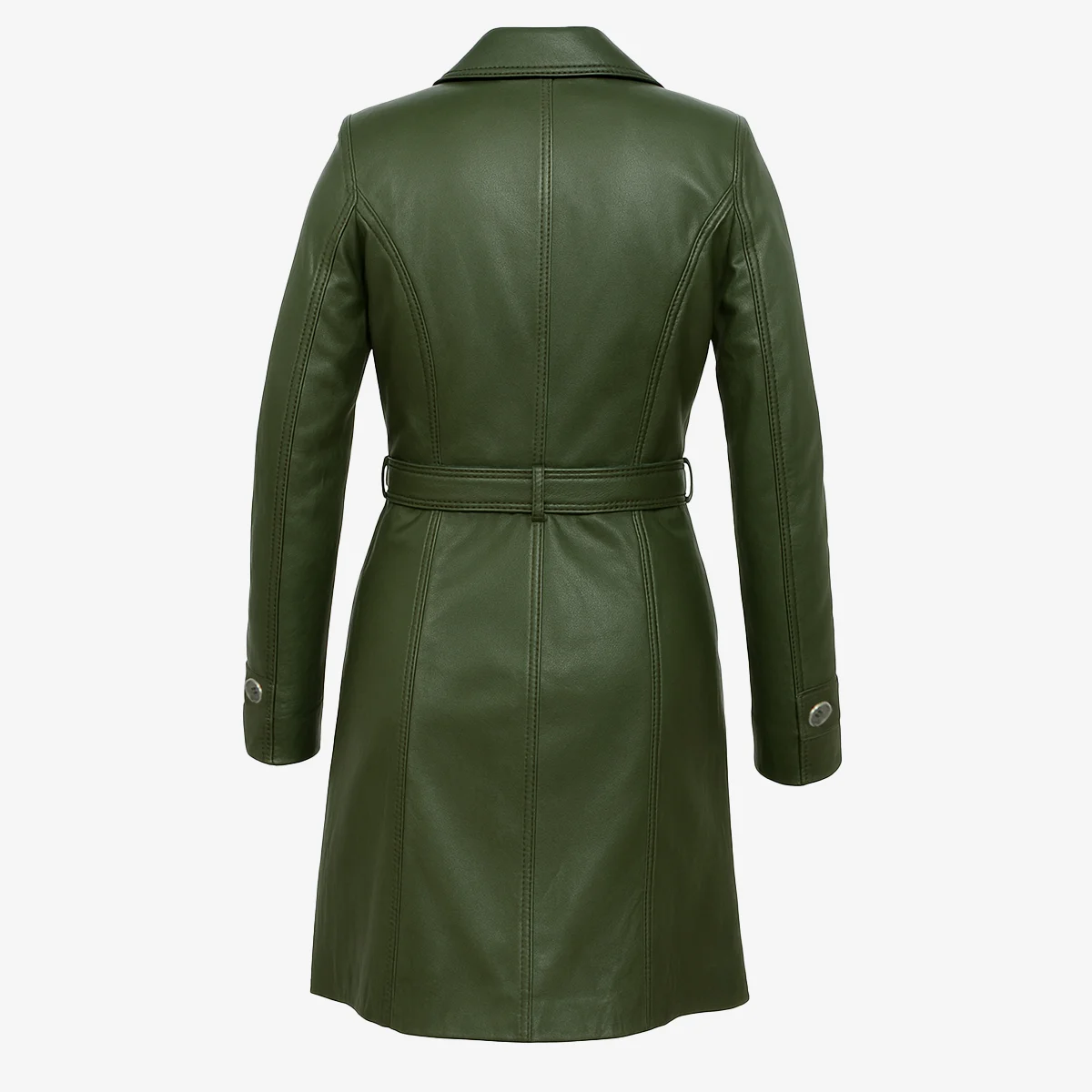 The Carlo Sacchi trench coat in wine-bottle green is a distinctive choice for women who dare. The dark green color radiates luxury and is, thanks to vegetable tanning, deep and rich in tone. The model ends just above the knee and is refined by the belt with gunmetal buckle. Inside, a light cotton lining provides daily ease and comfort. A coat that fits just as well with neutral basics as with pronounced shades.