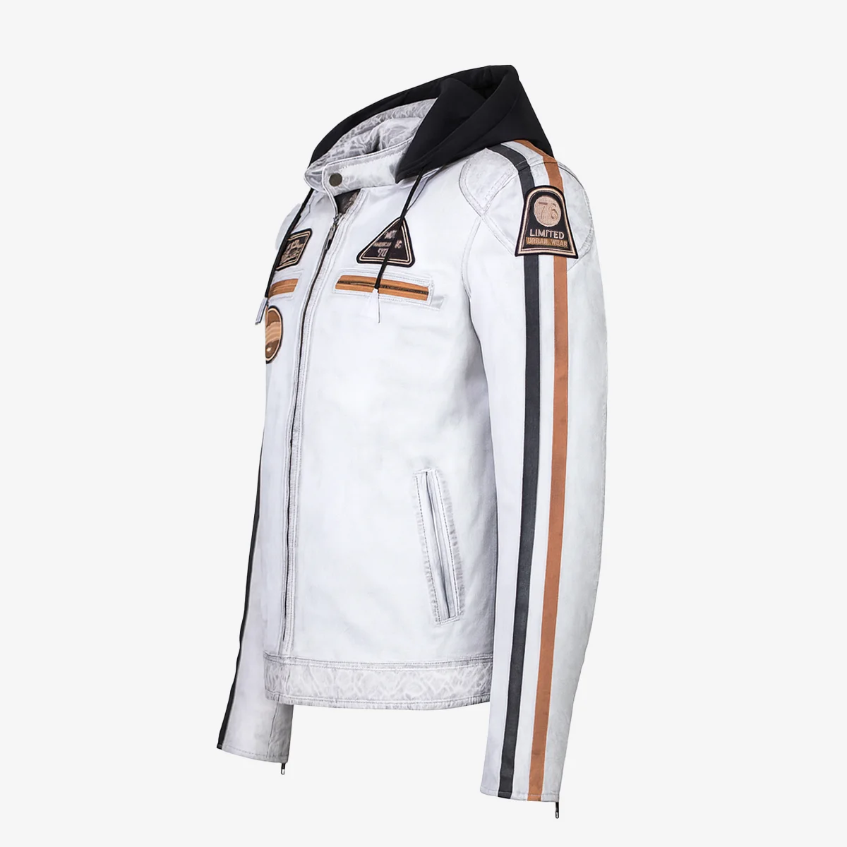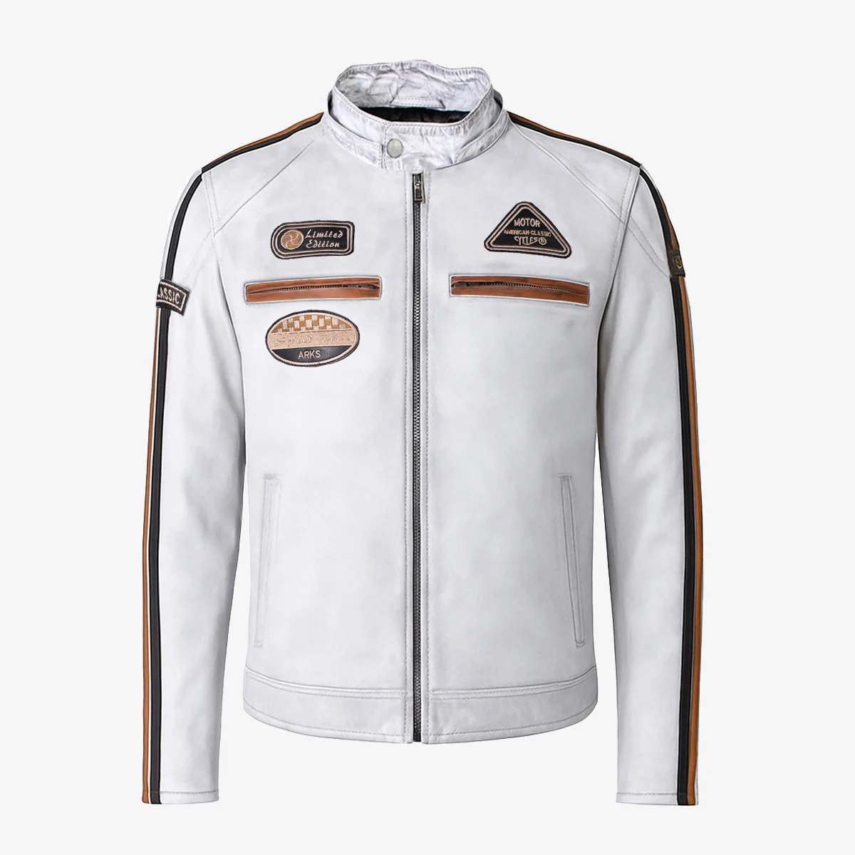 Mens leather biker jacket stripes/patches whiteT20