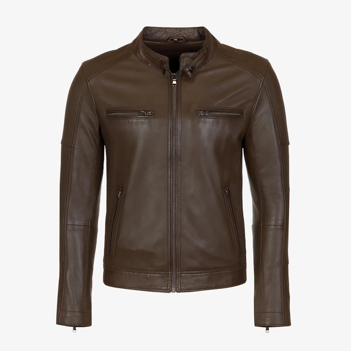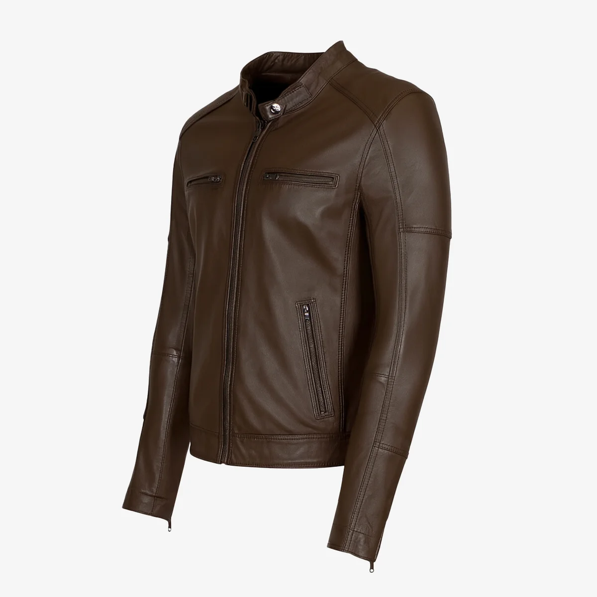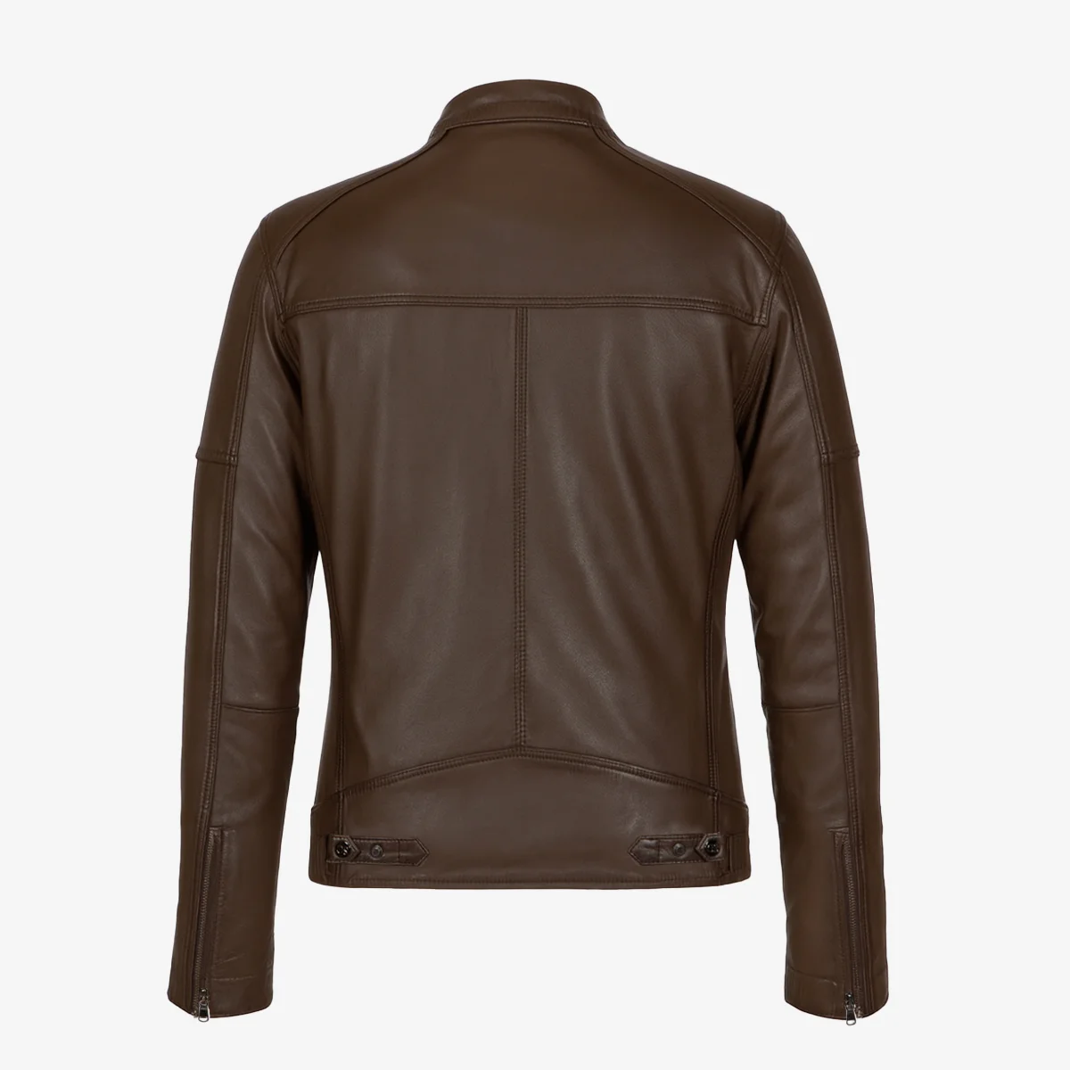 Introducing the Men’s leather jacket dark brown N082—classic elegance meets functionality. With buttoned buckle collar, elegant zipper closure, strategic pockets, slim fit, and adjustable buckle, it’s personalized for exceptional comfort and style. Crafted from premium sheep leather with cotton lining, it’s a perfect blend of fashion and function. Discover it today!