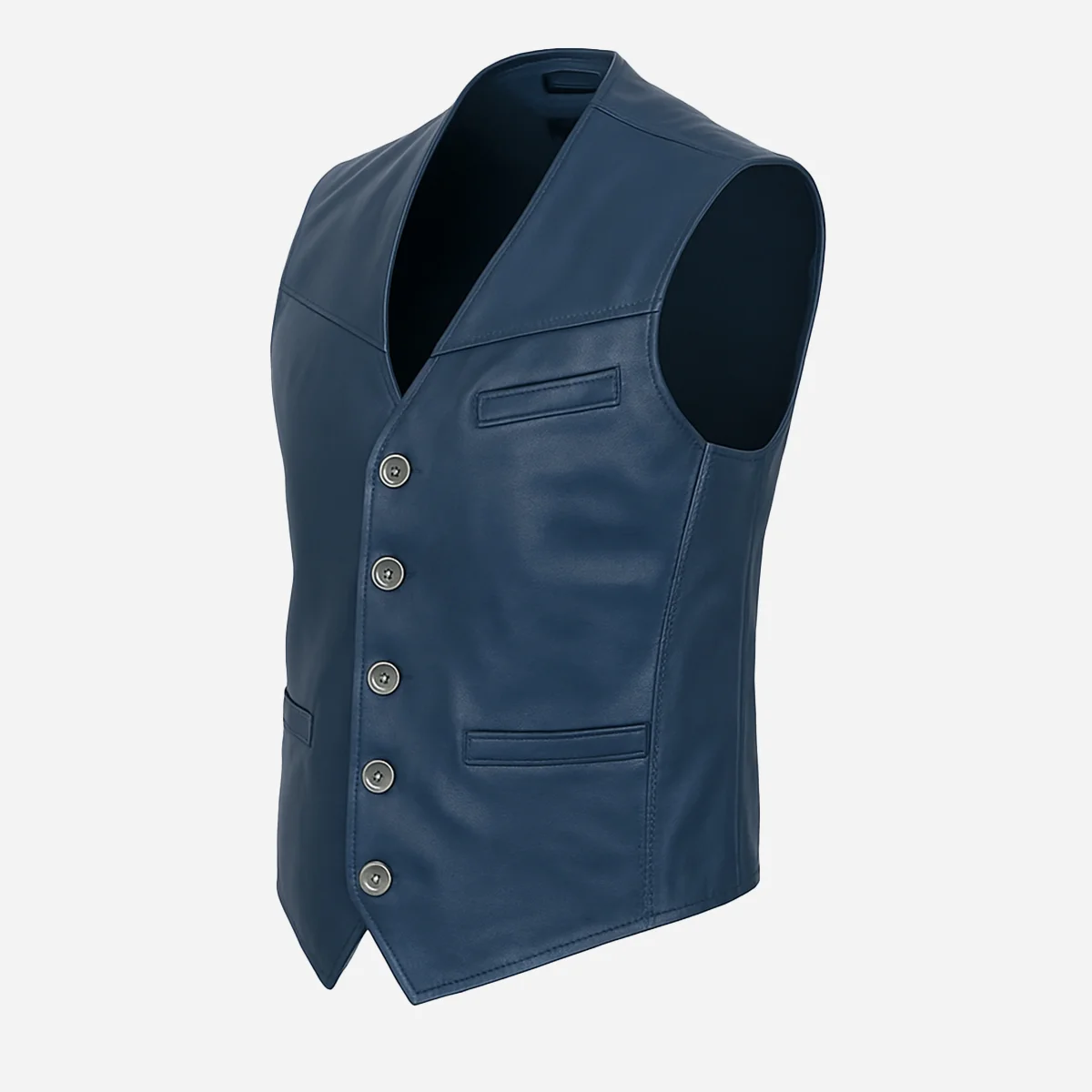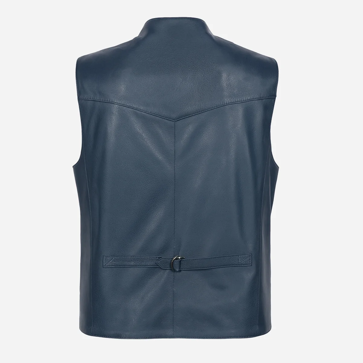 Elevate your style effortlessly with our Mens leather waistcoat blue 9914—a masterpiece blending sophistication and functionality. The refined front button closure and versatile chest pocket exude polished elegance. Two horizontal front pockets offer convenience, while the adjusted buckle ensures a customizable fit. Inside, find functionality with two pockets, one with a zip for valuables, all enveloped in breathable cotton lining. Available not only in classic black but also in Brandy, Black, Charcoal Blue, this waistcoat lets you express your style. With sizes ranging from small to extra-large, enjoy the perfect fit, marrying fashion and comfort seamlessly.