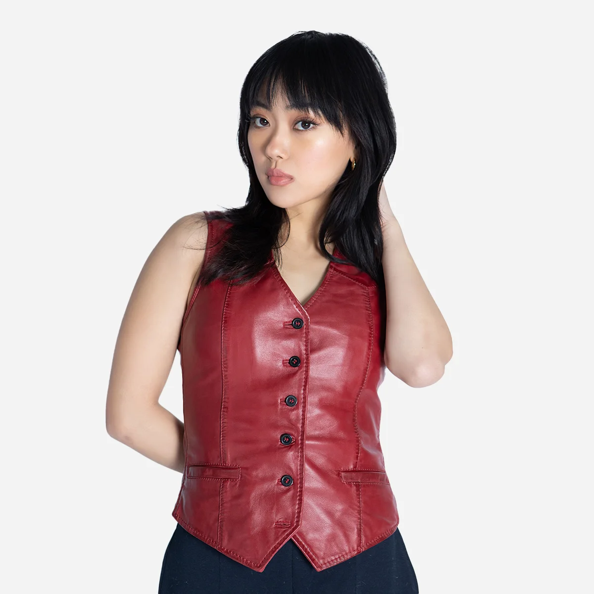 he Carlo Sacchi leather gilet in vibrant red radiates strength and passion. The black buttons give a bold edge, making this gilet a real eye-catcher. The tailored fit provides elegance, while the soft lamb leather feels like a second skin. Perfect as a striking item on simple jeans, a fitted shirt or as a top – exactly as our model wears it. An item that transforms every look into a statement.