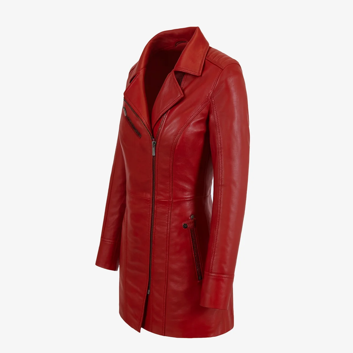 Introducing our Women’s Leather Half Long Jacket Sofia in captivating Red. This exquisite piece features an edgy asymmetrical front zipper and ample storage with zipped chest and front pockets. Stay organized with the inner vertical pocket and enjoy the flattering slim fit. Available in various sizes for a perfect fit. Make Sofia Red your style statement today.