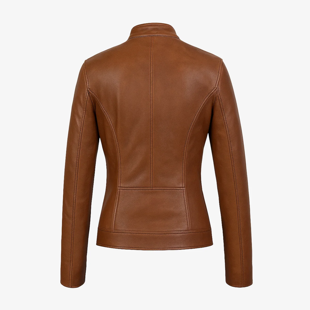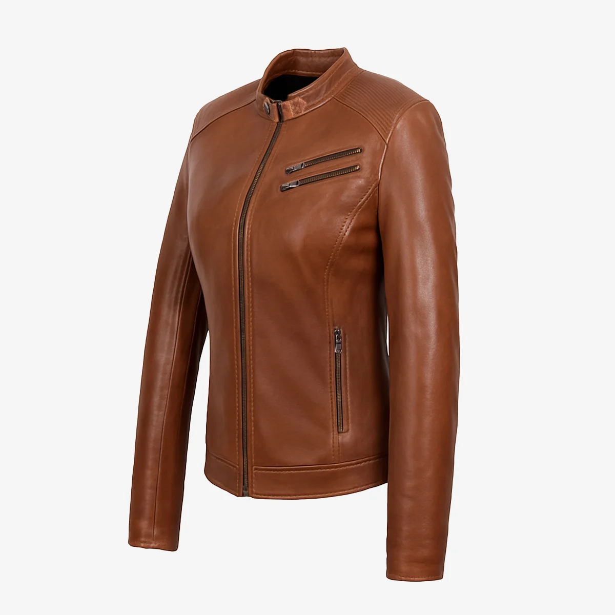Enhance your style with our Womens leather jacket brandy Sonia K. This jacket seamlessly combines fashion and functionality, featuring front zipper pockets on both sides for secure storage and a sleek look. With leather shoulder panels, a buckle closure on the collar, and a convenient interior vertical pocket, it’s a versatile addition to your wardrobe. Available in various colors and sizes, Sonia K’s jacket is the perfect blend of style and practicality for every occasion.