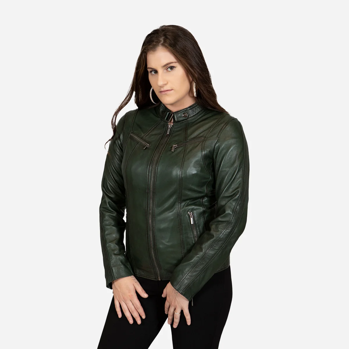Enhance your look with our Womens leather jacket green 9902 – a classic masterpiece that mixes fashion and functionality. Its center zip and button buckle collar fastening are both functional and fashionable. This jacket flawlessly marries elegance and comfort, with substantial storage, including chest and front zipper pockets, and a comfy 100% cotton inside. It’s a best-seller for a reason, and it comes in a number of attractive colors, allowing you to make a lasting impression.
