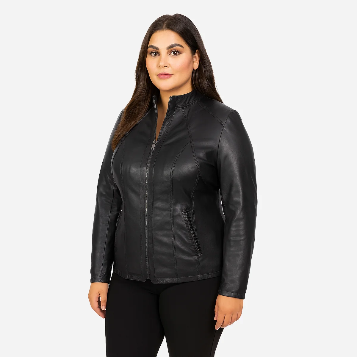 Elevate your style with our Womens leather plus size jacket black 998. Featuring a middle zip closure, two zipped front pockets, and an interior pocket, it offers convenience and warmth. The cotton lining ensures comfort, while stitching details add a unique touch. Available in various sizes, this versatile piece complements any outfit, making it a wardrobe essential.